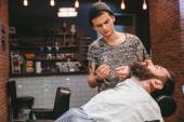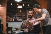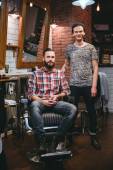 Uśmiechający się fryzjerka i plesed człowiek klient patrząc w lustro