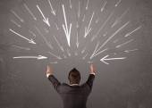 Biznes człowiek stojący z parasolem i wyciągnięte strzały uderzające go