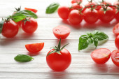 Pomidory wiśniowe z bazylią na drewnianym stole z bliska