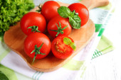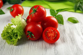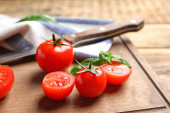 Pomidory wiśniowe z bazylią na drewnianym stole z bliska