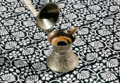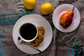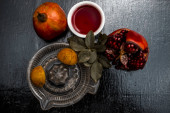 Selektywne focus na widelec na śniadanie, granatu i świeżą kawę