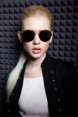 strzał studio kobiety w skórzany strój z długimi włosami. Profil