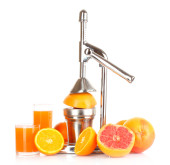 Ze stali nierdzewnej sokowirówki z kieliszek soku pomarańczowego na drewniane tła, z bliska