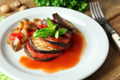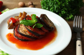Zdjęcie "Ratatuj na talerzu, na tle tabeli" może być wykorzystywane do celów osobistych i komercyjnych zgodnie z warunkami zakupionej licencji Royalty-free. Obraz jest dostępny do pobrania w jakości wysokiej rozdzielczości do 5760x3840.