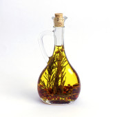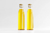 Dwie butelki z oliwy z oliwek i ziołami na białym tle