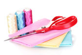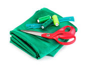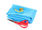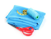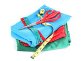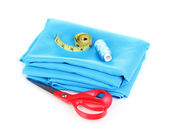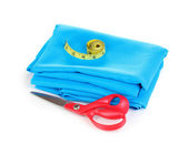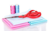 nożyczki i taśma pomiarowa na materiał na białym tle