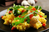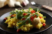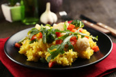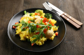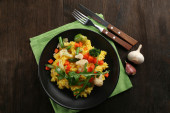 Ryż z warzywami na czarnej płycie na drewniane tła