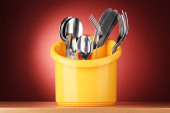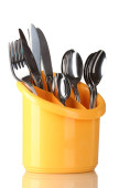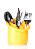 sztućce kuchenne, noże, widelce, łyżki w żółty stoją na białym tle