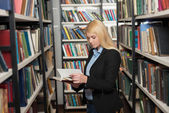 serious young girl with blonde hair sitting at a desk in the lib