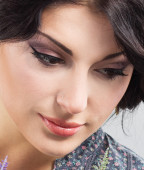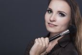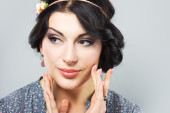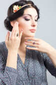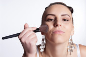 Beautiful brunette apply makeup in bright clothes. Portrait of a well-groomed woman.