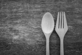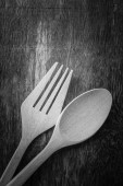 Stary tekstura tło brudne brudny stodoła deski i drewnianą łyżką i widelcem. Koncepcja kuchni rustykalnej. Widok z góry. Ilość wolnego miejsca dla tekstu. Kopiować miejsca. Czarno-białe Zdjęcie