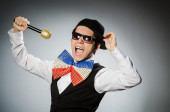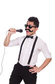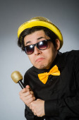 Zabawny człowiek z mikrofonem w koncepcji karaoke