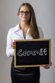 Podjąć decyzję - młody bizneswoman gospodarstwa tablica z tekstem