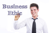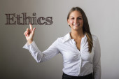 Business Ethic - Young businesswoman holding chalkboard with tex