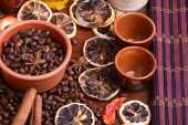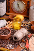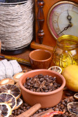 Zdjęcie "ziarna kawy, starą butelkę, świeca vintage zegar, cytryny, cynamonu, anyżu i aromat przypraw" może być wykorzystywane do celów osobistych i komercyjnych zgodnie z warunkami zakupionej licencji Royalty-free. Obraz jest dostępny do pobrania w jakości wysokiej rozdzielczości do 5760x3840.