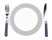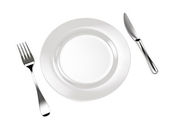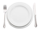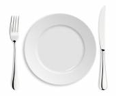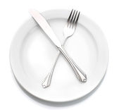 biały pustej płyty z widelcem i nożem na białym tle