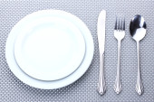 biały pustej płyty z widelec, łyżka, nóż na czerwony Obrus