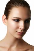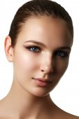 Make-up & cosmetics. Closeup portrait of beautiful woman model face with clean skin on white background. Natural skincare beauty, clean soft skin. Spa treatment