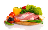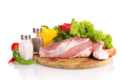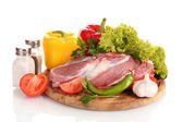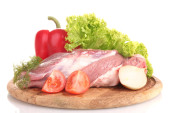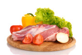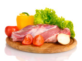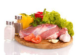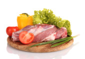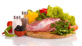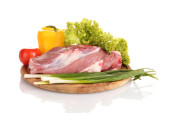 Surowe mięso i warzywa na deska na białym tle na Zielone Świątki?