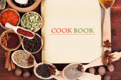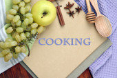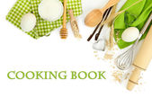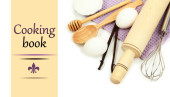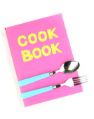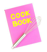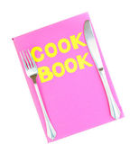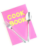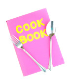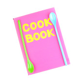 na białym tle naczynia kuchenne i różowy książka kucharska
