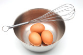metalowa Trzepaczka do ubijania jajek i brązowe jaja w miska na białym tle