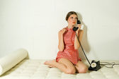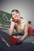 ubrana dziewczyna wzywa stary telefon w orange na kanapie