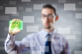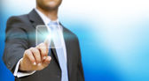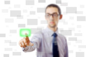 Biznesmen wciskający wirtualne przyciski
