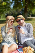 Szczęśliwa młoda para relaksujący na trawnik w parku lato. C miłości