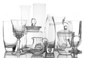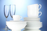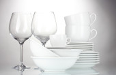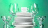 czyste talerze, szklanki i okulary na zielonym tle