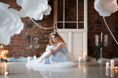 Piękna młoda kobieta w pięknej niebieskiej długiej sukience jak Kopciuszek z doskonałym makijażem i fryzurą