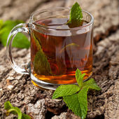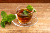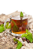 Szkło o filiżankę herbaty z mięty pozostawia na drewniane tła