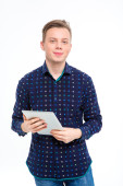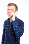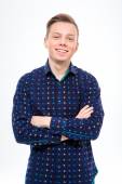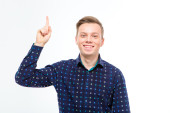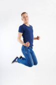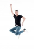 Podekscytowany szczęśliwy młody człowiek skoki i działa