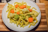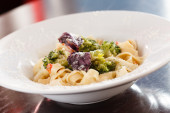 Makaron, brokuły, salami na deska