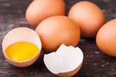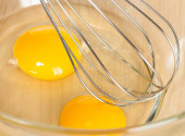 Drut trzepaczką i brązowe jaja, na białym tle.