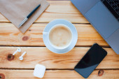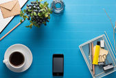 Biuro informacji turystycznej, materiały biurowe i filiżanka kawy