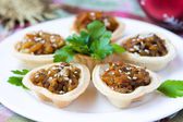 Kolędy z pieczarkami na czerwony serwetka z Boże Narodzenie zabawki