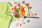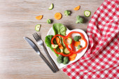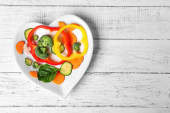 Zdjęcie "Przydatne pokroić warzywa na płycie w formie serca na drewnianym stole widok z góry" może być wykorzystywane do celów osobistych i komercyjnych zgodnie z warunkami zakupionej licencji Royalty-free. Obraz jest dostępny do pobrania w jakości wysokiej rozdzielczości do 5760x3840.