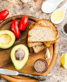 połówki Avocado, chleba, pomidory, zestaw produktów dla sandwiche