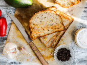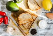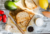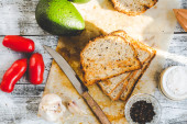chleb i cały awokado z pomidorkami, pieprz i garli
