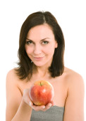 młoda kobieta piękne gospodarstwa czerwony dojrzałe jabłko w dłoni