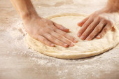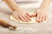 Ręce przygotowanie podstawa ciasta do pizzy na drewnianym stole, szczelnie-do góry