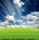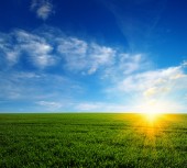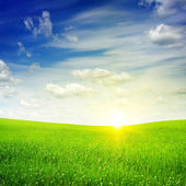 zachód lub wschód słońca w polu zielonym nad niebieski niebo pochmurne ziemie