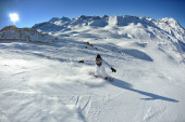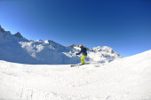 narciarstwo na świeżym śniegu w sezonie zimowym w piękny słoneczny dzień