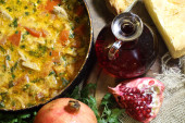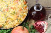 Mięso duszone z pomidora i cebuli na patelni z