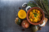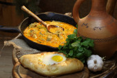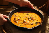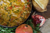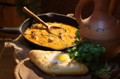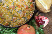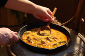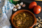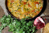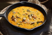 Mięso duszone z pomidora i cebuli na patelni z