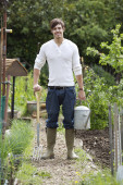 A young man with a blue watering can around the garden with cabbage on the farm in summer Sunny day