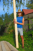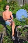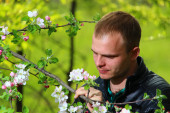 A young man about Bush Phlox on the plot in the summer on a Sunny day