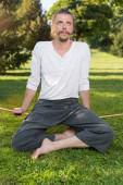 Young handsome man looks at a pine Board in the hands of about a pile of boards on the plot in the summer on a Sunny day