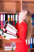 smutny nieszczęśliwa kobieta w biurze z kopiarki drukarki