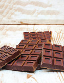 Broken tablet artisan chocolate on a wooden table elevated view